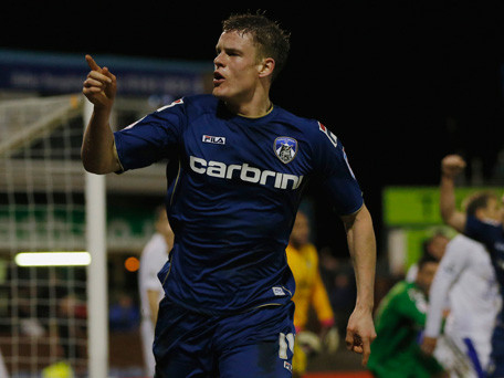 Oldham Athletic's Matt Smith celebrates after scoring the equalising goal during their FA Cup fifth round soccer match against Everton at Boundary Park in Oldham, northern England, February 16, 2013. (REUTERS)
