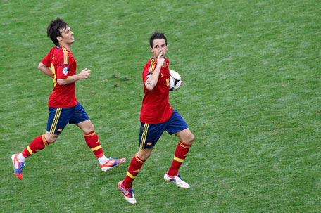 Spain's Cesc Fabregas (right) celebrates in front of team mate David Silva after scoring against Italy during their Group C Euro 2012 match at the PGE Arena stadium in Gdansk, on Sunday. (REUTERS)
