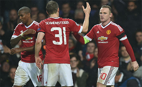 Manchester United's English striker Wayne Rooney (right) celebrates after scoring with midfielder Bastian Schweinsteiger (centre) anddefender Chris Smalling during a UEFA Chamions league group stage football match between CSKA Moscow and Manchester United at Old Trafford in Manchester, north west England on November 3, 2015. (AFP)