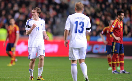 Alexander Ring (L) of Finland celerbrates after his team equalized against Spain during the FIFA 2014 World Cup Qualifier between Spain and Finland at estadio El Molinon on March 22, 2013 in Gijon, Spain. (GETTY)
