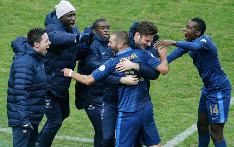 Karim Benzema of France celebrates with team-mates after scoring their second goal during the FIFA 2014 World Cup Qualifier Play-off Second Leg against Ukraine at Stade de France on November 19, 2013 in Paris, France. (GETTY)