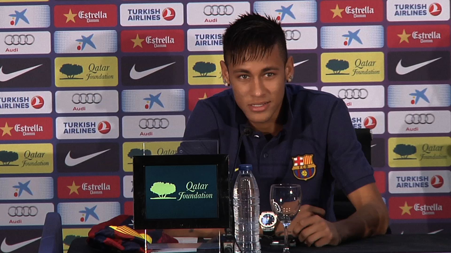 Barcelona : Santos and Brazil star Neymar was all smiles on Monday, as Barcelona presented him as the latest addition to the club, after the 21-year-old star, whose full name is Neymar da Silva Santos Junior, signed a five-year contract with the team.