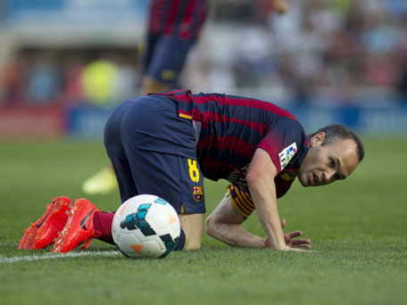 Barcelona's midfielder Andres Iniesta reacts during the Spanish league football match Elche CF vs FC Barcelona at the Martinez Valero stadium in Elche on May 11, 2014. (AFP)