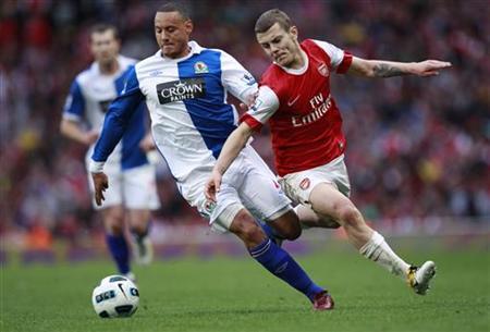 Arsenal's Jack Wilshere (R) challenges Blackburn Rovers' Jermaine Jones during their English Premier League soccer match at the Emirates Stadium in London April 2, 2011. (REUTERS)