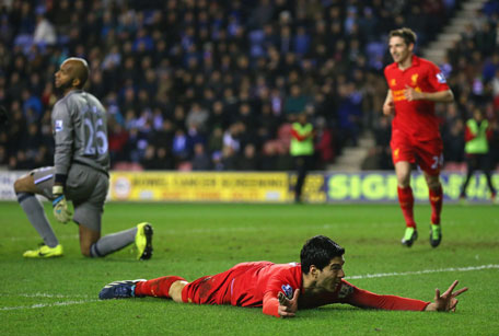Luis Suarez of Liverpool celebrates after scoring his third goal during the Barclays Premier League match agianst Wigan Athletic at the DW Stadium on March 2, 2013 in Wigan, England. (GETTY)