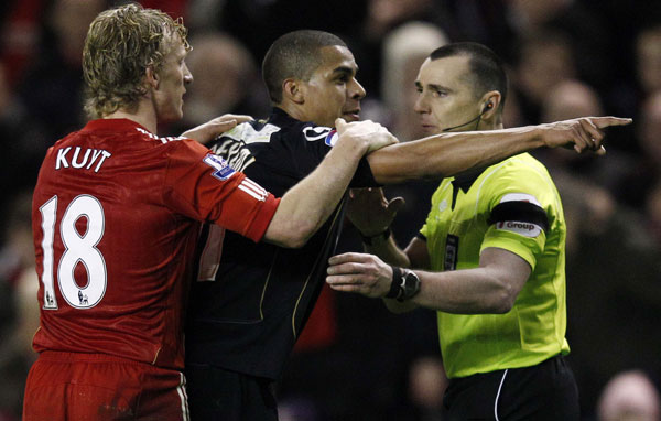 Oldham Athletic's Tom Adeyemi (C) points to the crowd as he is restrained by referee Neil Swarbrick (R) and Liverpool's Dirk Kuyt after a fan shouted abuse at him during their FA Cup soccer match at Anfield in Liverpool, northern England, January 6, 2012. (REUTERS)