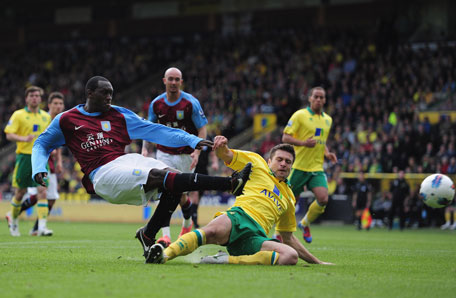 Emile Heskey of Aston Villa battles with Russell Martin of Norwich City during the Barclays Premier League match at Carrow Road in this May 13, 2012 file photo. (GETTY)