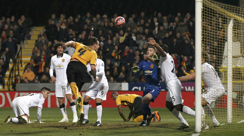 Cambridge United's English defender Josh Coulson (L) head unsuccessfully at goal from a corner during the FA Cup fourth round football match between Cambridge City and Manchester United at The R Costings Abbey Stadium in Cambridge on January 23, 2015. (AFP)
