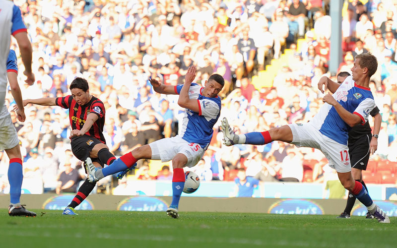 Samir Nasri of Manchester City scores to make it 3-0 during the Barclays Premier League match between Blackburn Rovers and Manchester City at Ewood Park in Blackburn, England. (Getty Images)
