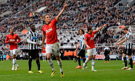 Manchester United's Adnan Januzaj (third left) celebrates scoring during their English Premier League soccer match against Newcastle United at St James' Park in Newcastle, England, April 5, 2014. (REUTERS)