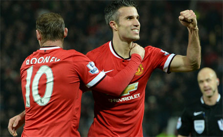 Manchester United's striker Robin van Persie celebrates scoring their third goal with Wayne Rooney during the English Premier League football match between Manchester United and Hull City at Old Trafford in Manchester, England, on November 29, 2014. (AFP)