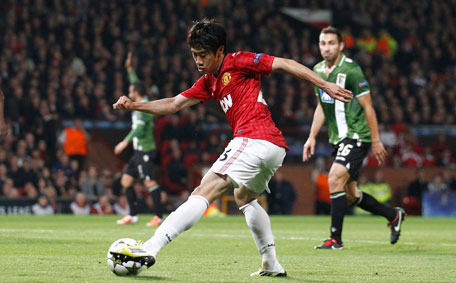 Manchester United's Shinji Kagawa crosses a ball during his team's Champion's League group H match against Braga at Old Trafford Stadium in Manchester, England, on October 23, 2012. (AP)