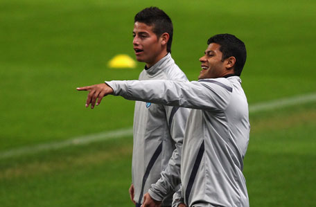 Porto's James Rodriguez (left) shares a joke with Hulk during a training session ahead of their UEFA Europa League round of 32 second leg match against Manchester City in this February 21, 2012 file photo. (GETTY)