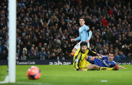 Steven Jovetic of Manchester City scores the first goal past Petr Cech of Chelsea during the FA Cup Fifth Round match between Manchester City and Chelsea at Etihad Stadium on February 15, 2014 in Manchester, England. (GETTY)