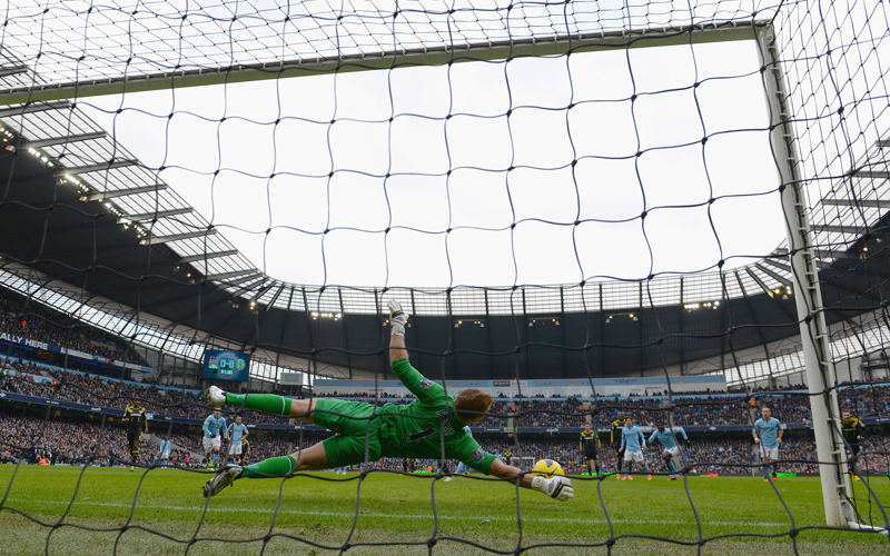 Joe Hart of Manchester City saves a penalty from Frank Lampard of Chelsea penalty during the Barclays Premier League match between Manchester City and Chelsea at Etihad Stadium on February 24, 2013 in Manchester, England. (Getty Images)