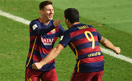 Barcelona forward Luis Suarez celebrates with Barcelona forward Lionel Messi after his goal against River Plate during the Club World Cup football final in Yokohama on December 20, 2015. (AFP)