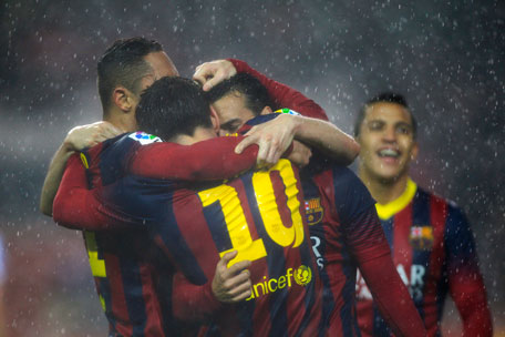Barcelona's Lionel Messi (10) is congratulated by team mates after scoring against Sevilla during their Spanish First Division soccer match at Ramon Sanchez Pizjuan stadium in Seville, February 9, 2014. (REUTERS)