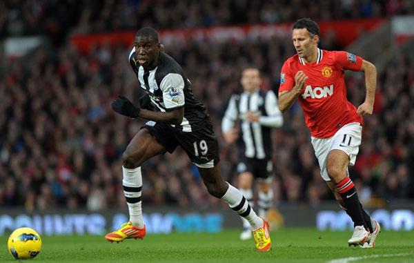 Newcastle United's French/Senegalese striker Demba Ba (L) vies with Manchester United's Welsh midfielder Ryan Giggs (R) during the English Premier League football match between Manchester United and Newcastle United at Old Trafford in Manchester, north-west England on November 26, 2011. (AFP)