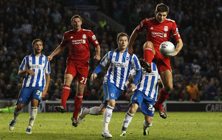 Liverpool's Steven Gerrard clears the ball during the Carling Cup third round match against Brighton & Hove Albion at the American Express Community Stadium on Wedensday in Brighton, England. (GETTY)