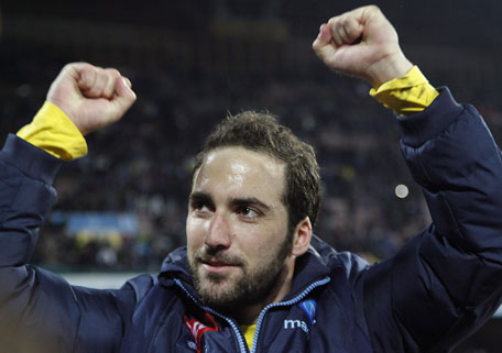 Napoli's Gonzalo Higuain celebrates after winning the Italian Cup semifinal second leg football match against AS Roma at the San Paolo Stadium in Naples, on February 12, 2014. (AFP)