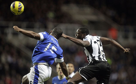 Newcastle United's Shola Ameobi (right) vies with Everton's Sylvain Distin during the English Premier League match at St James' Park in Newcastle, England on January 2, 2013. (AFP)