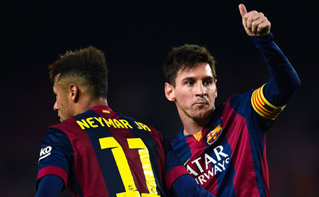 Lionel Messi of FC Barcelona celebrates with his team-mate Neymar of FC Barcelona after scoring his team's third goal during the Copa del Rey Round of 16 First Leg match between FC Barcelona and Elche CF at Camp Nou on January 8, 2015 in Barcelona, Spain. (Getty)