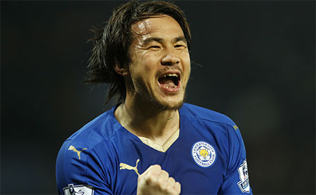Shinji Okazaki celebrates scoring the first goal for Leicester City v Newcastle United - Barclays Premier League - King Power Stadium - 14/3/16. (Action Images via Reuters)