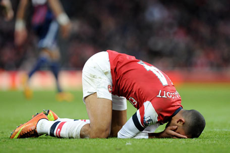 Arsenal's Theo Walcott kneels after being injured during the English Premier League match against Stoke City at the Emirates Stadium in England on Febuary 2, 2013. (AFP)