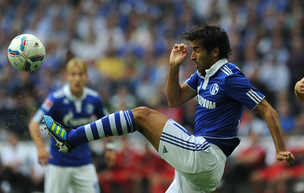 Schalke's Spanish striker Raul kicks the ball during the German first division Bundesliga football match FC Schalke 04 vs 1. FC Cologne in the western German city of Gelsenkirchen on August 13, 2011. Schalke won the match 5-1. (AFP)