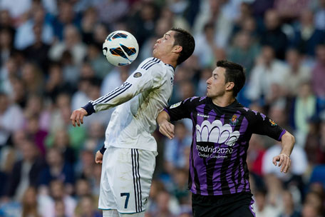 Cristiano Ronaldo of Real Madrid CF wins the header agaisnt Antonio Rukavina of Real Valladolid CF during the La Liga match at Estadio Santiago Bernabeu on May 4, 2013 in Madrid, Spain. (GETTY)