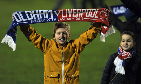 A young Oldham Athletic supporter celebrates after their 3-2 win in the English FA Cup fourth round match against Liverpool at Boundary Park, Oldham, England on January 27, 2013. (AFP)
