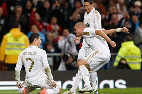 Real Madrid's Cristiano Ronaldo (left) celebrates after scoring a goal against Sporting Gijon with teammates Pepe and Angel Di Maria during their Spanish First Division match at Santiago Bernabeu stadium in Madrid on Saturday. (REUTERS)