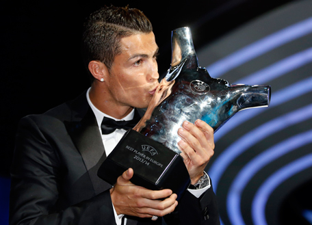 Real Madrid's Cristiano Ronaldo kisses his Best Player UEFA 2014 Award during the draw ceremony for the 2014/2015 Champions League Cup soccer competition at Monaco's Grimaldi Forum in Monte Carlo August 28, 2014. (REUTERS)