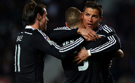 Karim Benzema of Real Madrid celebrates after scoring with his teammates Cristiano Ronaldo (right) and Gareth Bale during the La Liga match between Elche FC and Real Madrid at Estadio Manuel Martinez Valero on February 22, 2015 in Elche, Spain. (Getty Images)