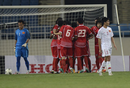 United Arab Emirates players celebrate after forward Ahmed Khalil scored the first goal during the Asian Cup 2015 qualifier against Vietnam in Hanoi on February 6, 2013. (AFP)