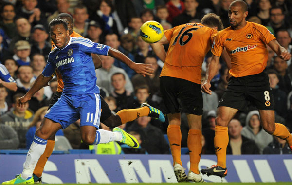 Chelsea's Ivorian striker Didier Drogba (L) vies with Wolverhampton Wanderers' Scottish defender Christophe Berra (2nd L) and English midfielder Karl Henry (R) during the English Premier League football match between Chelsea and Wolverhampton Wanderers at Stamford Bridge in London, on November 26, 2011. (AFP)