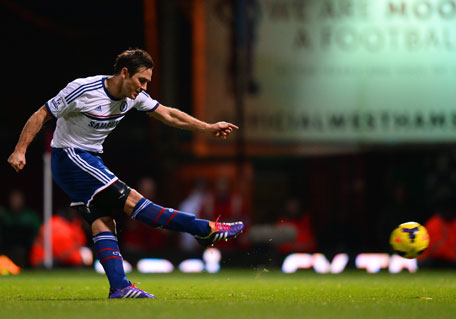 Frank Lampard of Chelsea scores the opening goal from the penalty spot during the Barclays Premier League match against West Ham United at Boleyn Ground on November 23, 2013 in London, England. (GETTY)