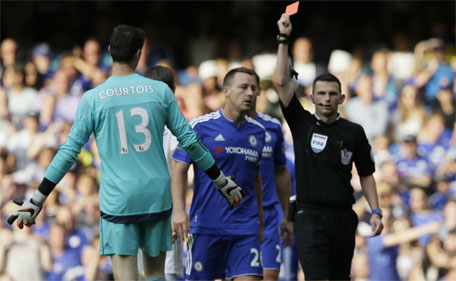 Chelsea’s Thibaut Courtois is given a red card by referee Michael Oliver during the English Premier League soccer match between Chelsea and Swansea City at Stamford Bridge, London, Saturday Aug. 8, 2015. (AP)