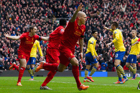 Liverpool's Martin Skrtel (centre) celebrates after scoring against Arsenal during their English Premier League match at Anfield Stadium, Liverpool, England, on Saturday February 8, 2014. (AP)
