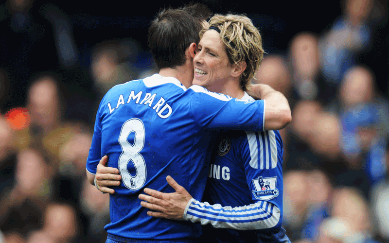 Fernando Torres of Chelsea celebrates with Frank Lampard as he scores their fifth goal and completes his hat trick during the Barclays Premier League match between Chelsea and Queens Park Rangers at Stamford Bridge in London, England. (Getty Images)