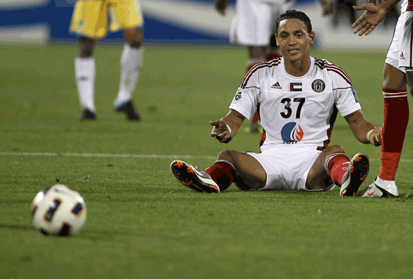 Brazilian striker Ricardo Oliveira of UAE's Al Jazira reacts after a foul during their AFC Champions League group A match against Qatar's Al Gharrafa in Doha on Wednesday. (AFP)