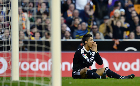 Real Madrid's Cristiano Ronaldo sits on the field during the Spanish league football match Valencia CF v Real Madrid CF at the Mestalla stadium in Valencia on January 4, 2015. (AFP)
