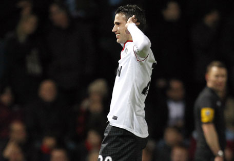 Manchester United's Robin van Persie celebrates scoring his goal during the English FA Cup third round match against West Ham United at the Boleyn Ground, Upton Park, in East London on January 5, 2013. (AFP)