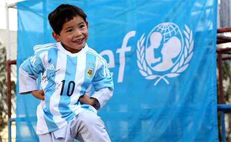 Murtaza Ahmadi wearing the autographed jersey sent by Lionel Messi. (Photo courtsey Unicef)
