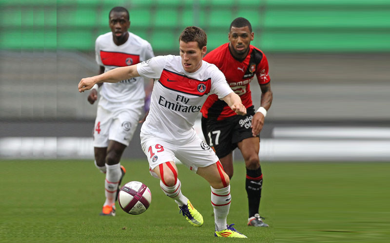 Paris Saint-Germain's Kevin Gameiro (front) is challenged by Rennes' Yann M'Vila (R) during a French Ligue 1 soccer match in Rennes, France, on August 13. (Agencies)