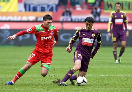 Magomed Ozdoyev (left) of FC Lokomotiv Moscow battles for the ball with Odil Ahmedov of FC Anzhi Makhachkala during the Russian Football League Championship match at Lokomotiv Stadium on March 18. (FILE)