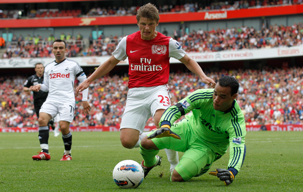 Arsenal's Andrey Arshavin, center, competes with Swansea City's goalkeeper Michel Vorm during their English Premier League soccer match at Emirates Stadium, London, Saturday, Sept. 10, 2011. (AP)
