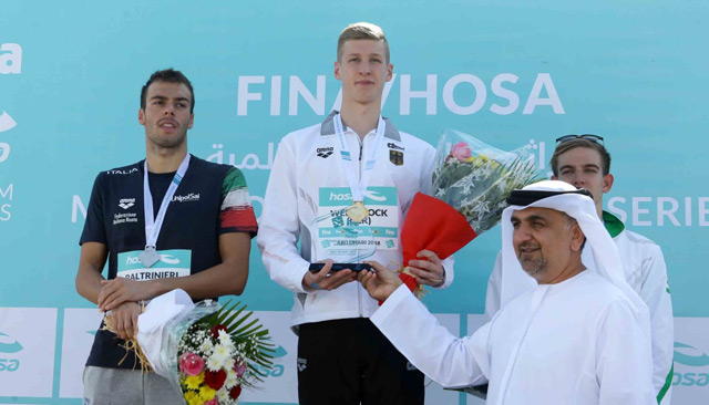 Aref Al Awani, Secretary-General of the Abu Dhabi Sports Council, ADSC; Sultan Al Samahi, President of the UAE Swimming Federation, and Cornel Marcalescu, FINA’s Executive Director, gave away the medals and trophies to the winners.