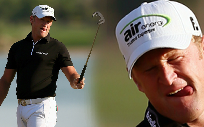 Jamie Donaldson of Wales reacts after playing a shot during the final round of the Abu Dhabi Golf Championship at the Abu Dhabi Golf Club in the Emirati capital. Jamie Donaldson reeled in red-hot Justin Rose to win the championship. (AFP)