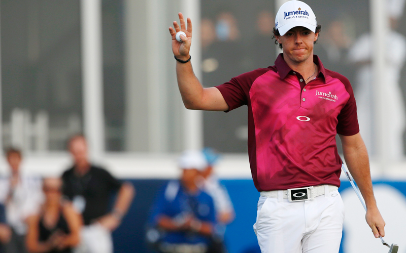 Rory McIlroy of Northern Ireland gestures at the 18th green during the third round of the DP World Tour Championship at Jumeirah Golf Estates in Dubai. (REUTERS)